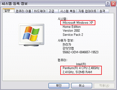 - (이미지 설명) Intel(R), Pentium(R) 4 CPU 2.40Ghz, 512MB RAM